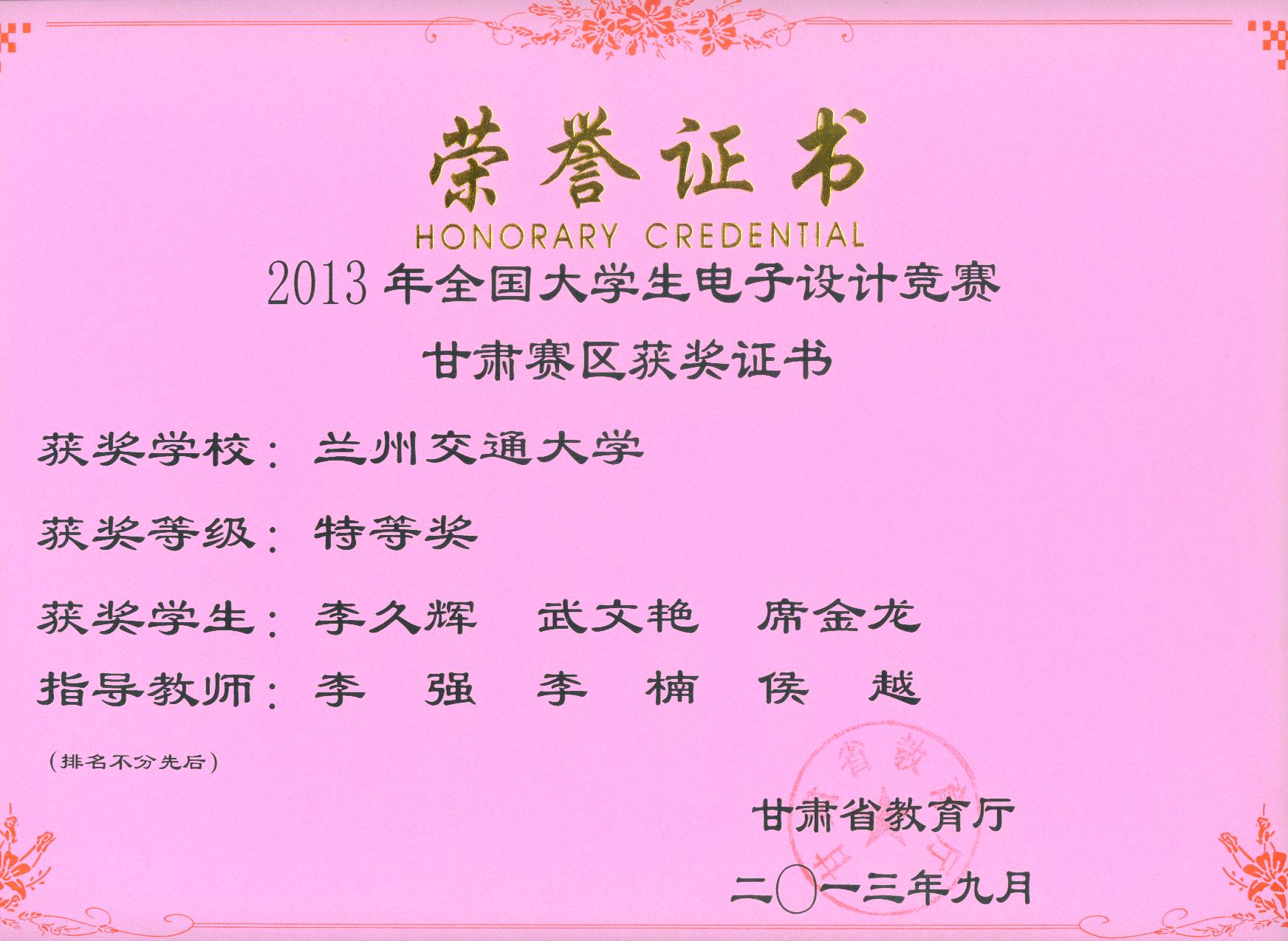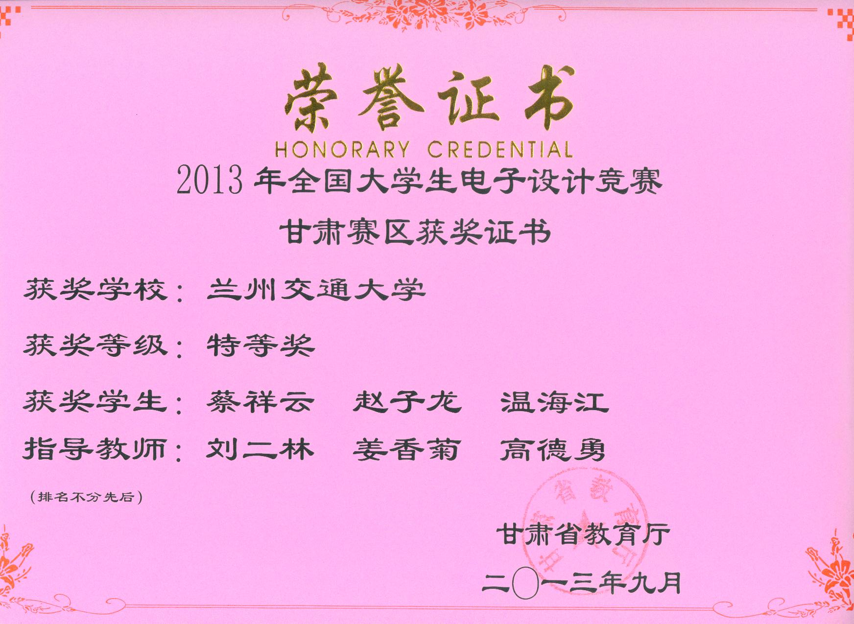 近日甘肃省教育厅公布了2013年全国大学生电子设计大赛甘肃赛区获奖名单。在教务处、实验室管理处、电工电子实验中心的精心组织下,我校代表队获全国二等奖3项,省特等奖1项, 一等奖9项, 二等奖1项。获奖数量据甘肃高校之首。