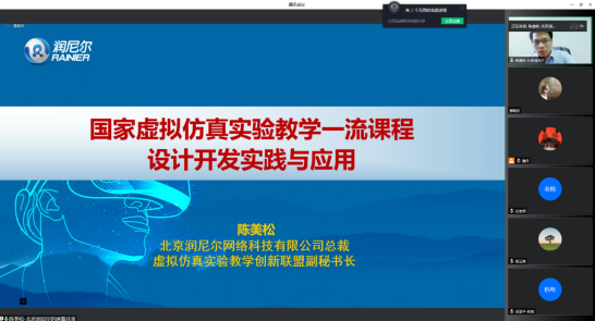 北京润尼尔网络科技有限公司总裁、虚拟仿真实验教学创新联盟陈美松副秘书长作了“国家虚拟仿真实验教学一流课程设计开发实践与应用”报告,分享了高校和企业分工合作、课程开发涉及的技术方案等方面的经验。