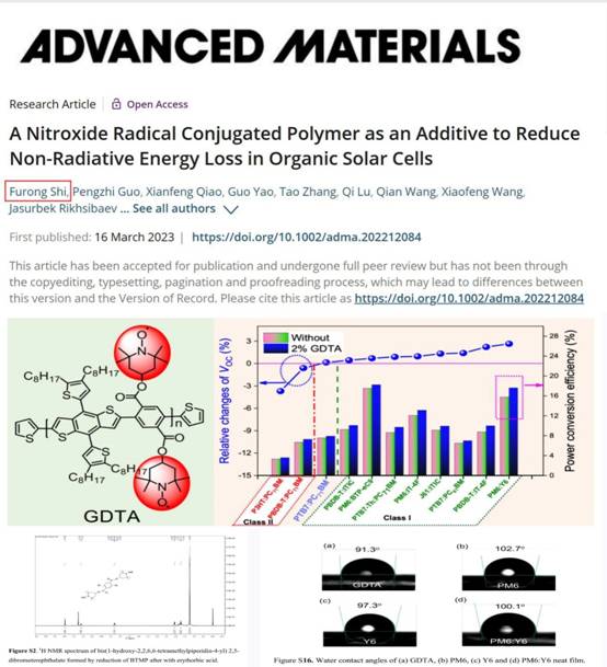 2023年,我校夏养君教授课题组在国际材料领域顶级学术期刊《Advanced Materials》(影响因子:32.086)在线发表了题为“A Nitroxide Radical Conjugated Polymer as Additive to Reduce Non-Radiative Energy Loss in Organic Solar Cells”的学术论文。这也是我校首次以第一作者和通讯作者单位在该国际期刊上发表学术论文。该文章中的关键材料——新型有机光电材料的结构表征与鉴定全部在我校分析测试中心平台核磁共振设备上完成,论文中涉及相关薄膜材料的表面特性参数(如:静态接触角、表面张力、表面能等)也在分析测试中心视频光学接触角设备上完成,如下图所示。