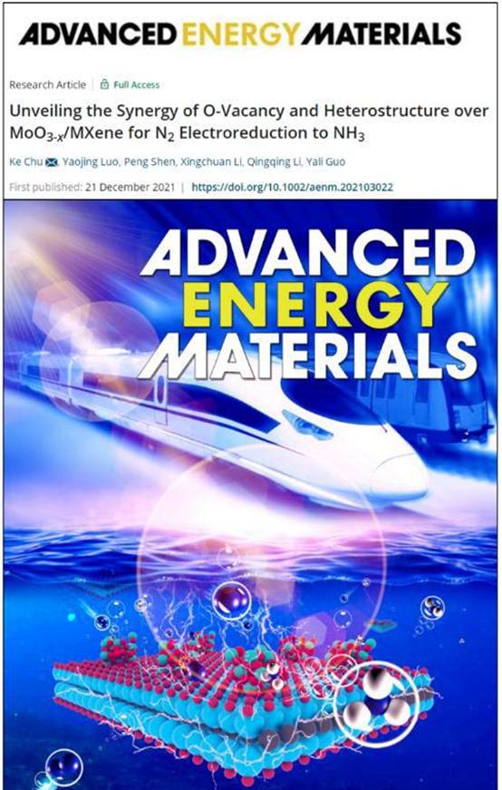 2022年,我校材料学院褚克教授课题组在国际材料及能源顶级学术期刊《Advanced Energy Materials》(影响因子:29.368)发表了题为“Unveiling the Synergy of O-Vacancy and Heterostructure over MoO3-x/MXene for N2Electroreduction to NH3”的高水平学术论文,兰州交通大学为该论文的独立完成单位和通讯单位,褚克教授为唯一通讯作者,这也是我校首次在该级别期刊以第一通讯单位发表论文,该论文中核心材料的14N、15N等磁共振波谱数据采集由我校分析测试中心500 MHz超导核磁共振平台完成。