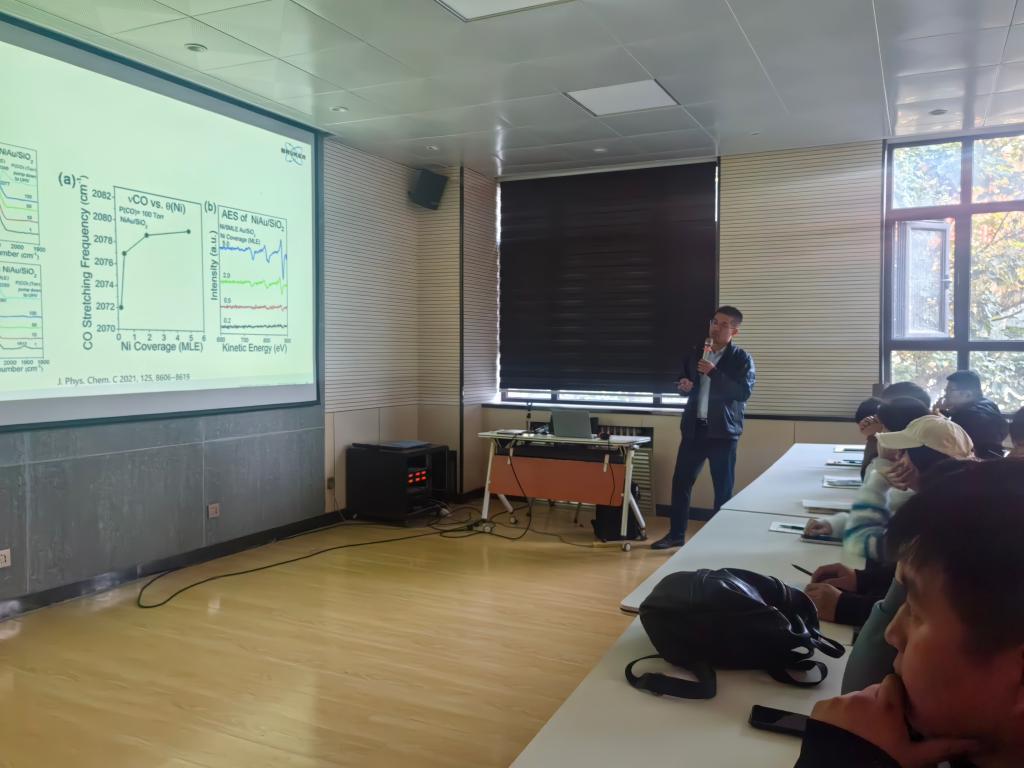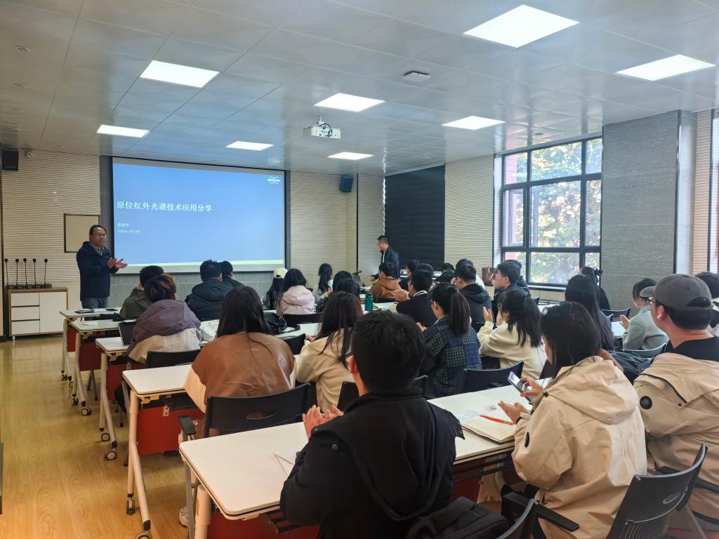 陈贵平工程师介绍了原位红外光谱的原理和技术特点、真空原位漫反射在光热催化研究中的应用、真空原位电化学在电化学催化研究中的应用等典型案例、原位红外光谱仪设备的维护和使用注意事项等内容,并与参会人员进行了深入交流,解答了学校师生们的常见测试问题。在实操环节,陈工程师在我校VERTEX 70v红外光谱仪上进行了现场演示,并与学生们进行了深入的技术探讨和交流。通过本次分享会,师生们进一步了解了众多高精尖原位红外技术,提高了大家对样品的分析测试能力。