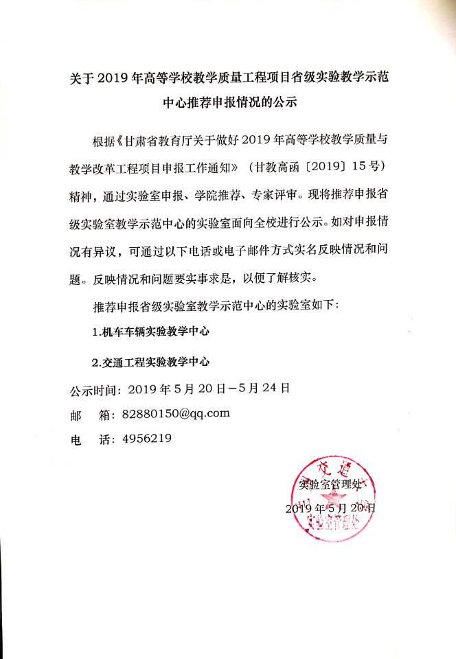 关于2019年高等学校教学质量工程项目省级实验教学示范中心推荐申报情况的公示