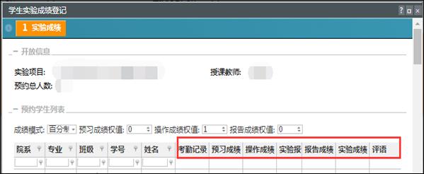 3.指导教师进入到成绩登记页面后,系统会出现“考勤记录”、“预习成绩”、“操作成绩”、“报告成绩”、“实验成绩”和“评语”等项目,教师可根据自己的实际情况选择合适的项目录入,不要求全部录入。如下图所示。