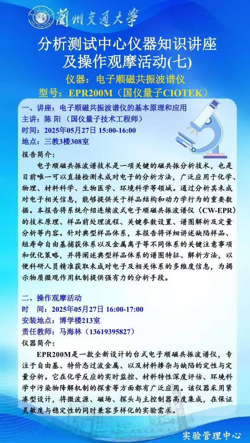 实验管理中心分析测试中心定于2025年5月27日举办本年度第七期仪器知识讲座及实操观摩活动,欢迎感兴趣的师生参与。具体事宜通知如下: