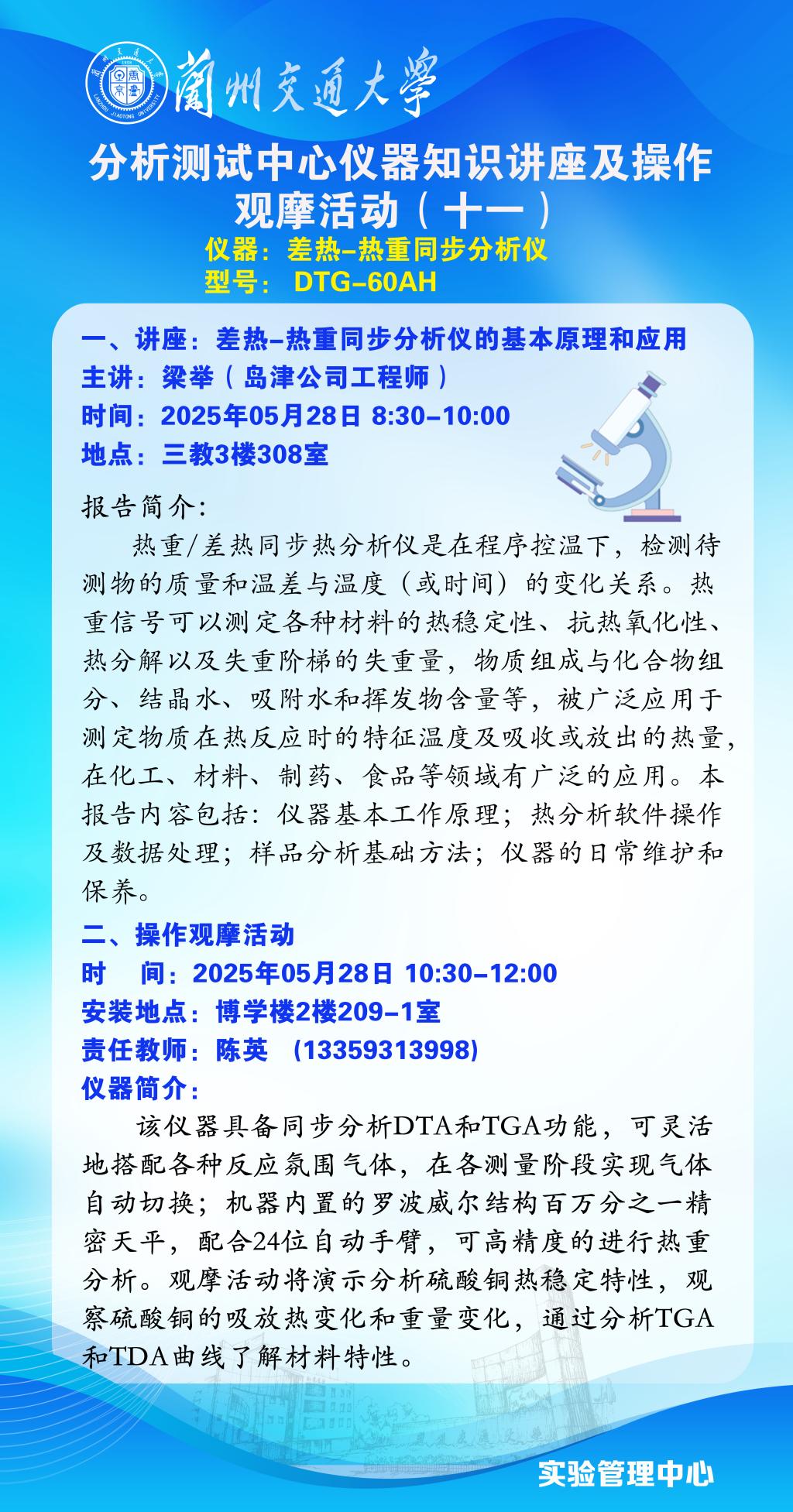 实验管理中心分析测试中心定于2025年5月28日举办本年度第十一期仪器知识讲座及实操观摩活动,欢迎感兴趣的师生参与。具体事宜通知如下: