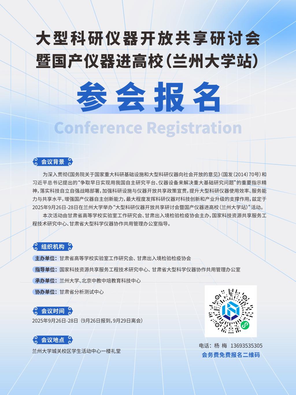由甘肃省高等学校实验室工作研究会、甘肃出入境检验检疫协会联合主办的“大型科研仪器开放共享研讨会暨国产仪器进高校(兰州大学站)”活动,定于2025 年9月26日至28日在兰州大学举行,请各单位积极组织选派相关人员参会。现将有关事项通知如下: